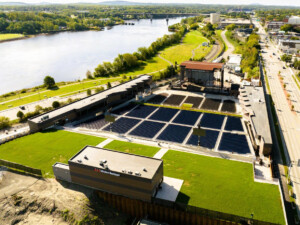 This open-air amphitheater along the Penobscot River waterfront features several small green roof areas installed by Apex Green Roofs. Naturcycle extensive green roof media installed in conjunction with sedum mats provides the nutrients and structure to support the low-growing greenery. While intensive green roof media is typically used for deeper applications supporting larger plants, extensive green roof media is perfect for shallower applications like this, which are designed for sedums and grasses.