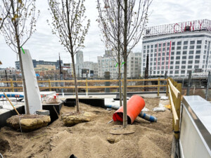 The ongoing redevelopment of the Domino Park neighborhood by Two Trees Management includes this retail complex with a large public square. The buildings are topped with large planters containing Naturcycle® Intensive 95 green roof media. The alpine setting of trees and shrubs with large areas of sedum are thriving in our consistent high-quality blends. Downes Forest Products installed this material using slinger trucks due to site accessibility, propelling over 700 cubic yards of media with a special machine and filling these deep planters over large underground and above ground structures.