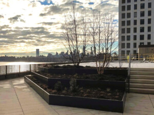 The rooftop on the Astoria West residential complex at 30-77 Vernon Blvd was the vision of landscape architecture firm MPFP. Naturcycle Intensive 75 and Extensive 85 media was blown up to the roof by Applied Mulch & Soil and installed by Elevations Landscape Design + Build, supporting plantings from sedum mats to full-size trees.