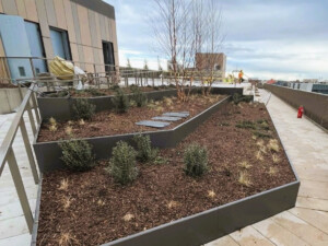 Commercial spaces throughout the Northeast are seeking out more natural settings for their employees and residents. The rooftops of garages and other structures allow for the design of unique green spaces like the one at 400 Atlantic Street in Stamford, CT. Large planters filled with Naturcycle® Intensive 75 green roof media provide a diverse plant palette and excellent drainage. The team at Executive Landscaping worked hard to make this incredible outdoor vision a reality.